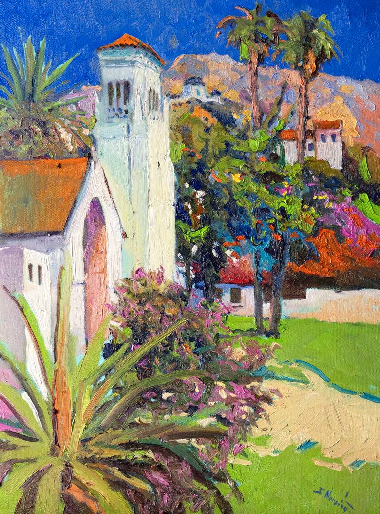 The beautiful colonial architecture of the Hispanic church in contrast with the bright colors of the summer sky and the amazing foliage of Mediterranean gardens together create a contrast full of harmony and a dynamic sense of life. Impressionistic brushstrokes, Fauve colors, and shapes in the lands...