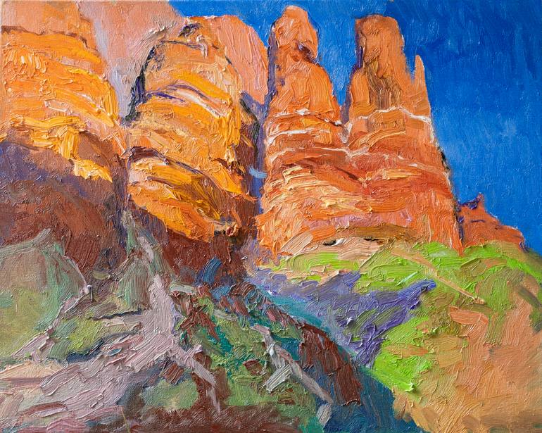 Orange bright colored rocks, called Red Rocks look beautiful in nature under the bright sun. Thick, expressive brushstrokes reflect the feeling I received from nature while I was painting this artwork. The painting is on oil/primed canvas, sides are painted, it has a wire, and can be displayed even ...