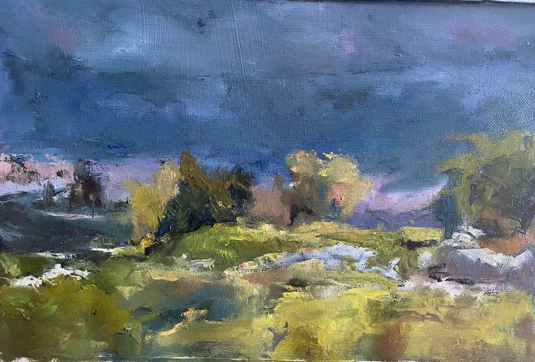 Impressionistic oil painting on un-stretched canvas. Dark storm clouds create an atmospheric background.