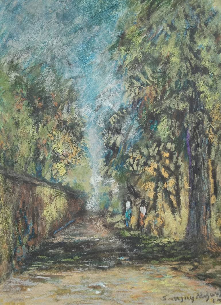 I am a practicing artist living by a small meandering river Dulung, on the margins of a tiny village-turning-to-a-town. My principal activity includes teaching children to draw and paint. I believe their way of looking at the world is way apart from how we grownups see reality. A child's world view is more surreal, resembles some kind of magic realism-- as opposed to the pragmatic vision of us, elders. This, you can say, is my chief source of inspiration... and even the subject of many of my artworks. In some way I strive to be a life-long-learner. I've been impressed by the 20th Century impressionist, swayed by the sketches of da-Vinci, Turner, Manet... and of course Dali. I'm attached to a circle of contemporary artists of my locality who work with different medium from painting to sketches, photography to sculpture, installations and experimental art forms. Their works make me think deeply, pick up an idea once in a while and keep me going. My works over the last decade-and-half include a variety of tastes from small charcoal to occasional etchings, interluded by a period of water-colors and a long stretch of oil paintings. Most of my recent artworks use natural color hand-ground from different soil-textures, rocks, and sometimes extracted from leaves, fruits or seeds. I prepare them myself in a marble mortar and pestle-- dry them, and mix the semi-ground pigment grains with a glue to give the effect of a natural grainy hue with a permanent fix.