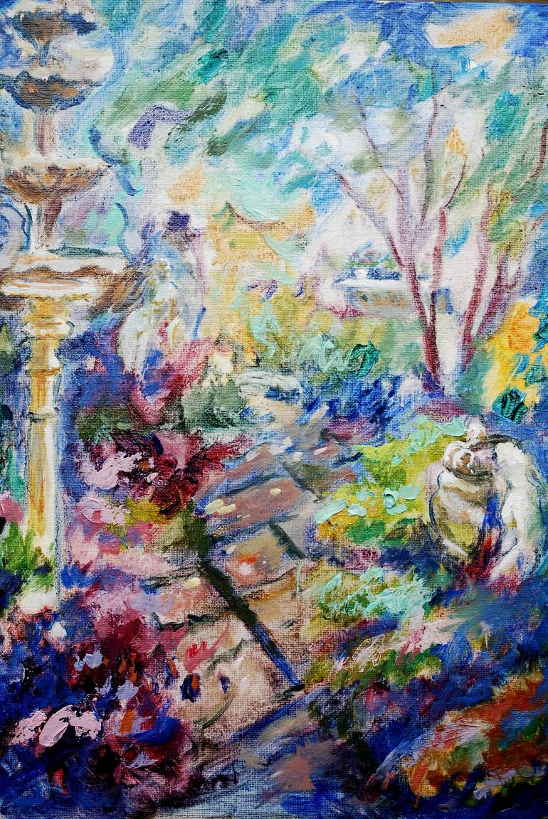 There are lovely statue arrangments at Larch cottage and this impressive "toucan fountain" near the centre. I used safflower oil with the paint and tried to paint it expressively to get the effect of the sunlight.
