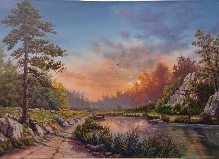 Large original oil painting landscape lake by Mecid elsepti Painting