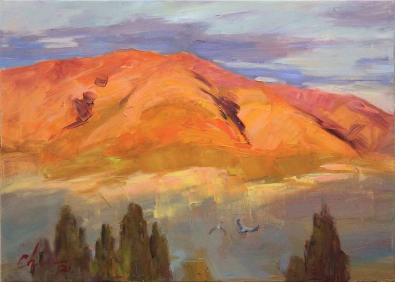 This painting will come to you stretched on a wooden stretcher and completely ready for placement in the interior. ABOUT THE ART WORK Captured in vibrant oils, this piece is a passionate fusion of light and landscape, where the fleeting warmth of the setting sun kisses the earth goodbye. Swirls of...