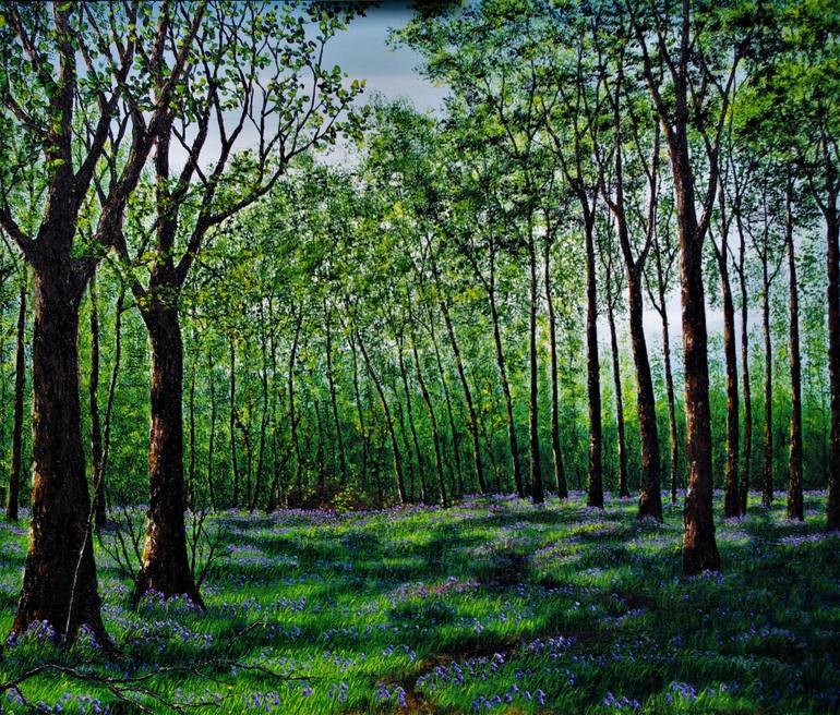 textured, atmopheric , oil painting of a forest covered in a carpet of bluebells, There is a magical glow, coming from the late spring canopy of leaves, giving us a beautiful green light and shadows, right across the forest floor. Layered and painted on all sides , with pallet knife and brush. Pri...