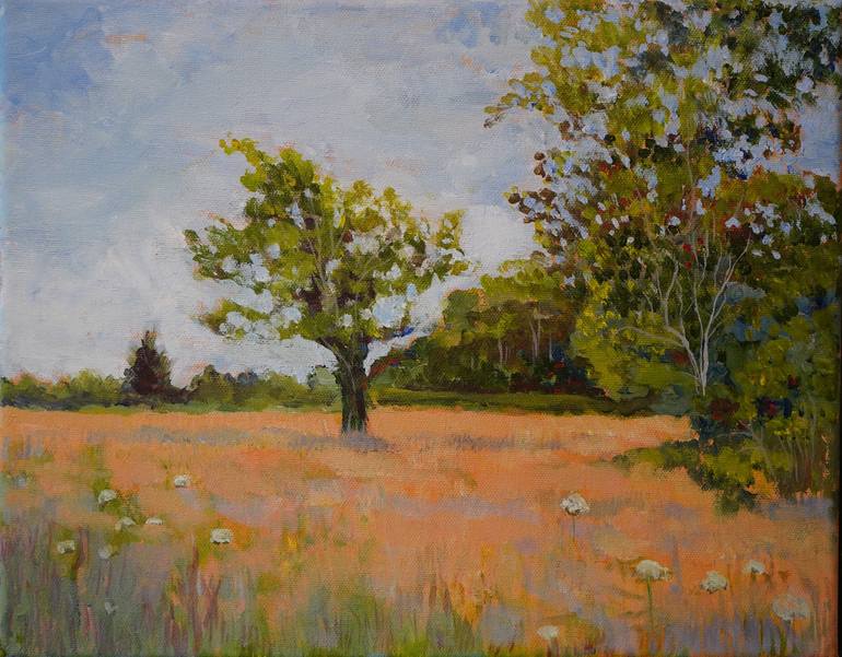 This painting was inspired by a recent road trip from North Carolina to Maine and back. There were many stops alongside the road. I loved the colors of the grass. This is a one-of-a-kind acrylic painting.
