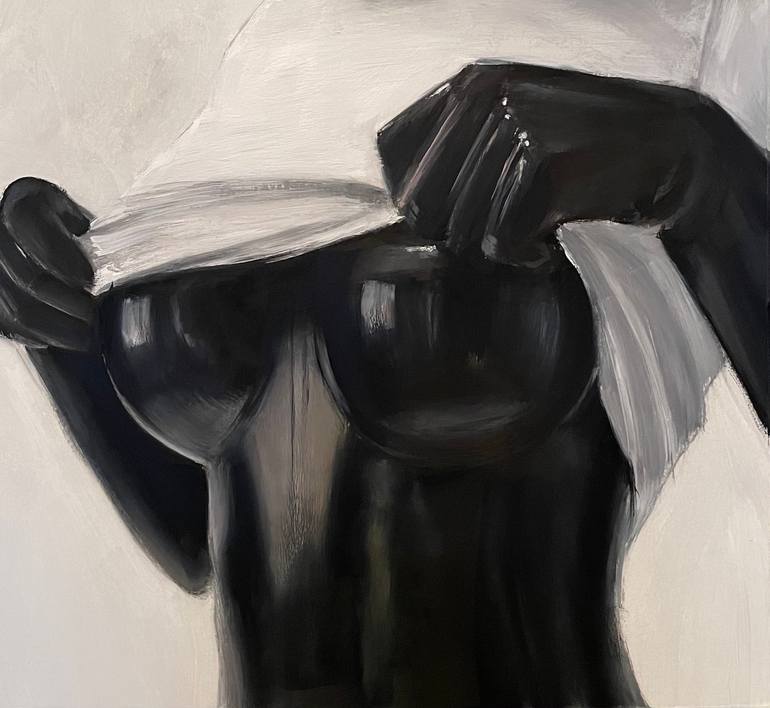 My aim for this painting was to capture the high shine of the lady flashing her latex outfit unearth a plain white top. using oil on paper to capture that scratched colourful tones of the latex as it reflects the lights in front of her.