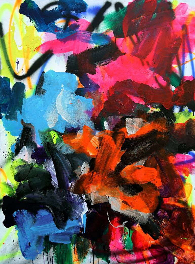The paintings are thought process driven and reflective... My process is organic, beginning the paintings with gestural brush marks, impulsive scrawling and graffiti. Layers are introduced in stages and the direction of the painting is informed and influenced by each previous mark and colour. They ...