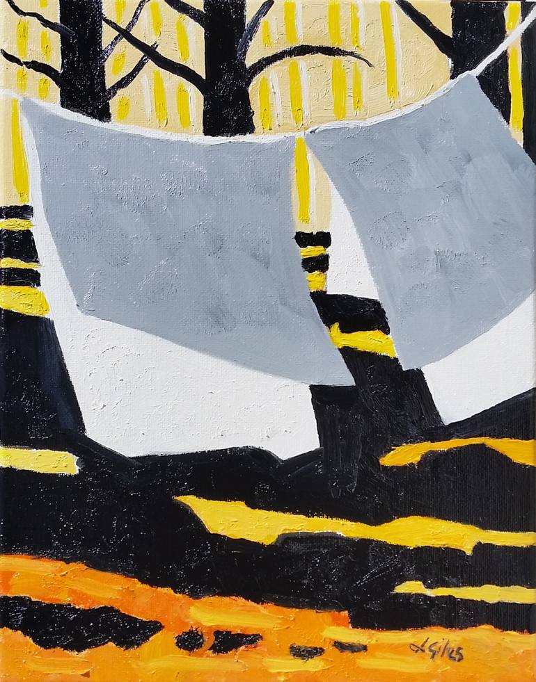 Laundry floats in the breeze at the back of my studio. Dramatic light contributes to a stylized view. I use quality Winsor & Newton oil paint with Da Vinci linseed oil. The painting is varnished with Winsor & Newton retouching varnish & is ready to hang with hooks & picture wire attached