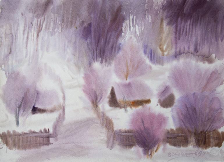 This evocative watercolor painting captures the serene beauty of a winter landscape, cloaked in soft lavender and pastel tones. With its dreamy, impressionistic style, the work invites viewers into a tranquil world where nature merges with abstraction. Gentle washes of color and delicate brushwork e...
