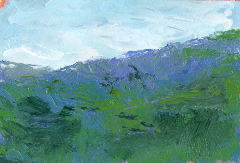“Lavender Ridge Line” (Tessi No. 16) is a crisp collision between tranquil sky and the dense thrum of land. The composition is sharply divided: above, a soft, near-translucent sky blue set against a field of green and violet so layered it verges on impassable. The palette hums with contrast—cool ser...
