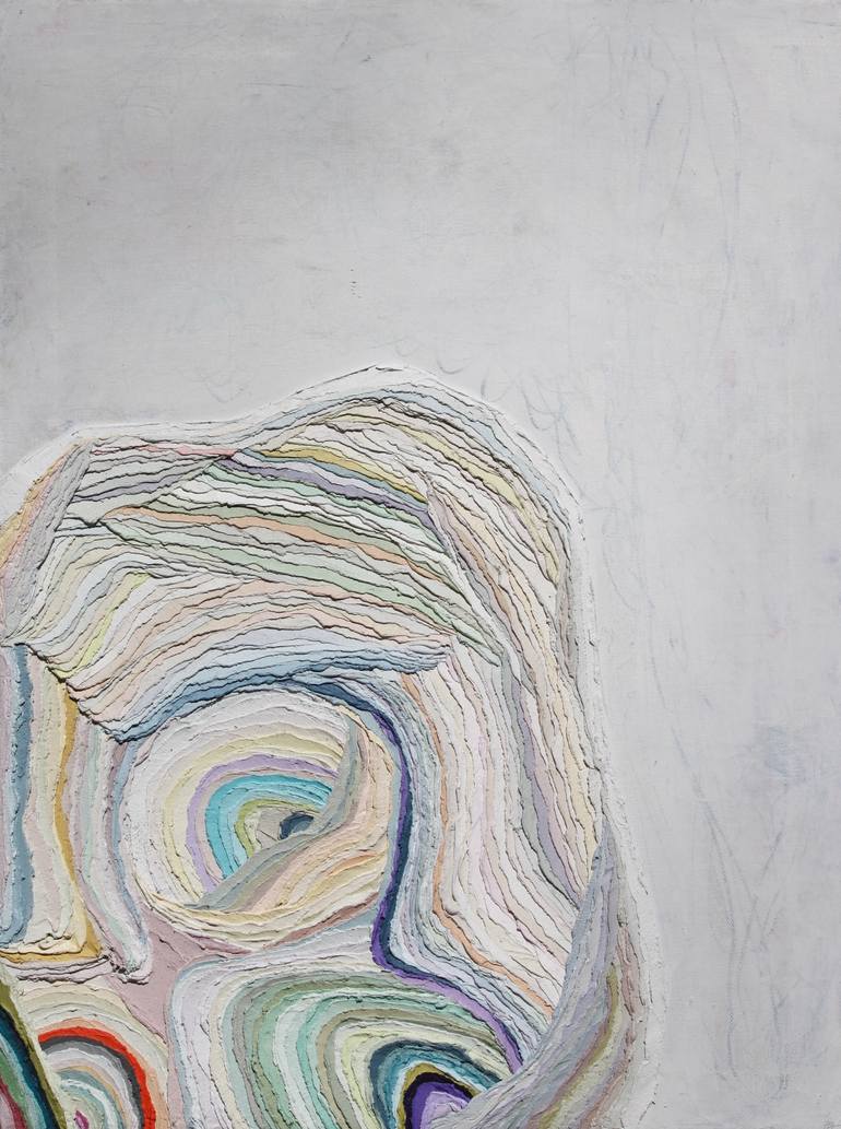 These are abstract expressionistic paintings with colorful textural patchwork elements. Materials are an important part of each piece tempting desires to touch and feel.