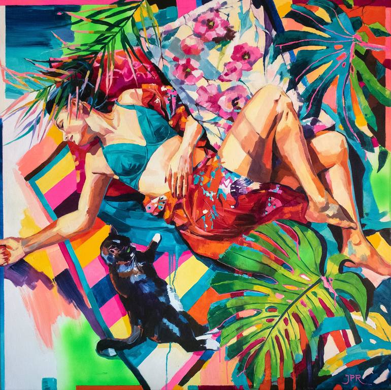 'Lazy weekend', like most of the paintings from the 'Intimate Times' series, is a self-portrait of the artist. The scene shows a woman resting in her garden in the company of her cat Mia. Joanna shares her good moments in everyday life. She focuses on self-care and shares the importance of taking ti...