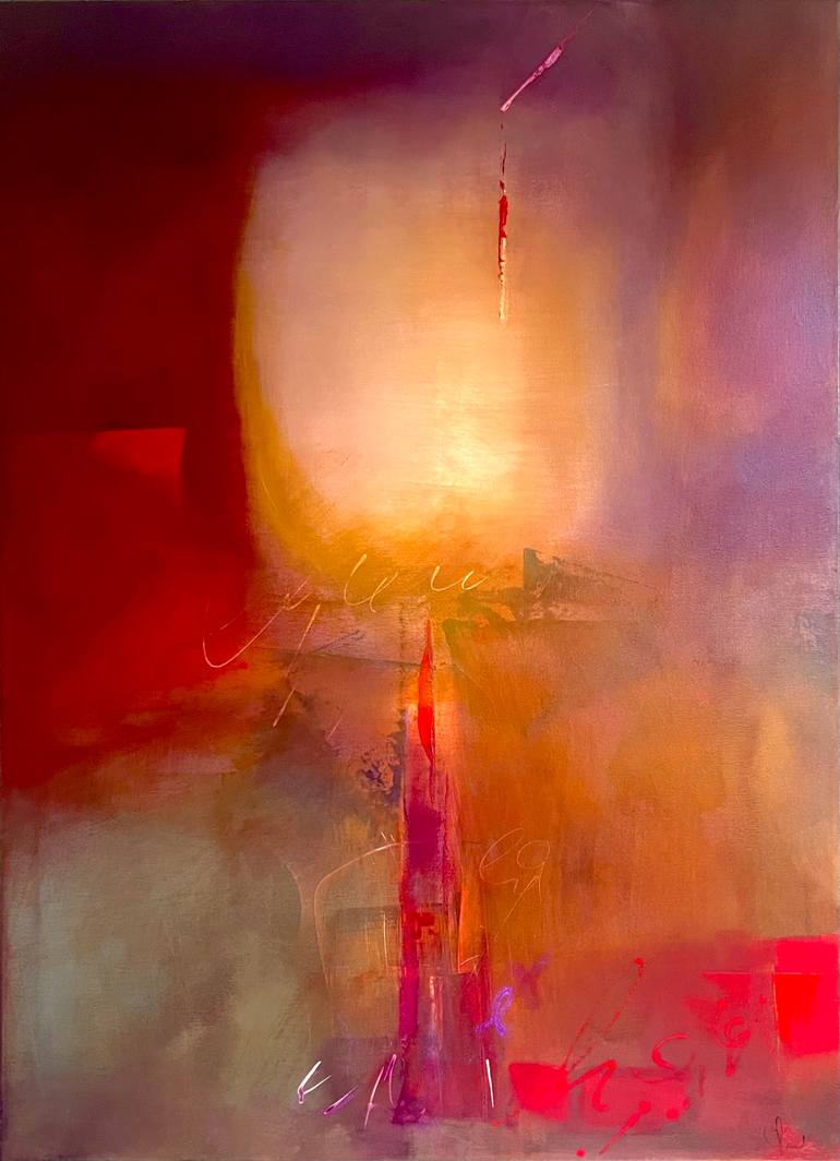 This original abstract painting, "Le nouveau verre," is an explosion of light and color on canvas. Warm hues of red, orange, and yellow blend and merge, creating a dynamic sense of heat and energy. The visible brushstrokes and textured paint add a tactile dimension, inviting you to explore the depth...