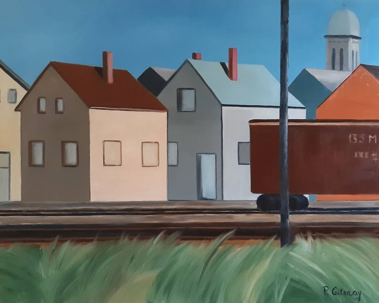Ce tableau de Patricia nous montre le dernier wagon d'un train à l'arrêt sur une voie ferrée, à proximité d'un village, dont les façades des maisons sont illuminées de soleil, on aperçoit le clocher de l'église à l'arrière plan. Un poteau électrique occupe verticalement la toile. Patricia a traité ...