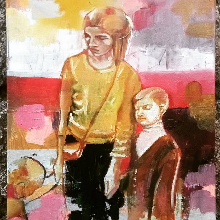 The feeling of security when a child leans on its mother, the complex dynamics and feelings of siblings, depicted in hues of pink, yellow and brown, with bold and textured brushstrokes. A small painting that says a lot.