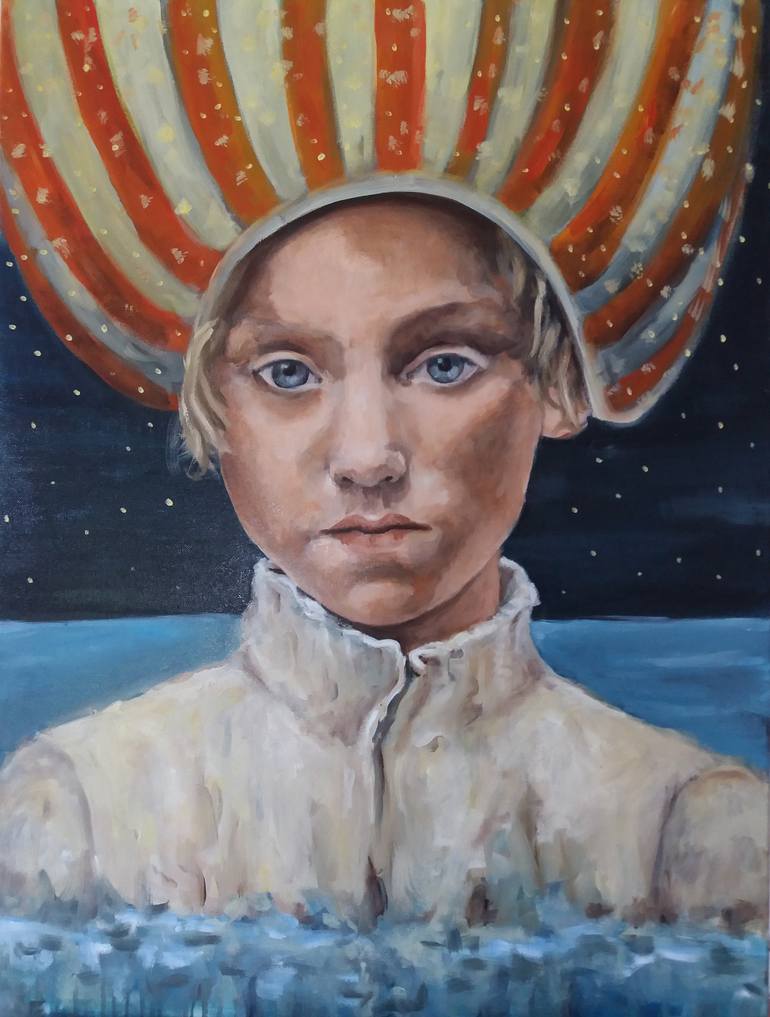 Undine with a big hat - like a balloon - is in the sea. She looks intensely at the viewer. my interest is in the people and here the existential, psychological questions. the sea stands for subjectivity, solitude, as it were. we suffer, we fail - that is a fundamental principle of life