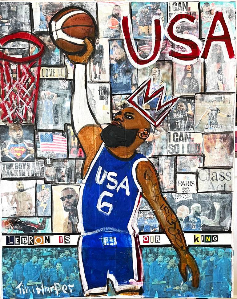 Hot off the Paris Olympics and a USA Basketball gold medal run, this painting is collage with a painting of Lebron James over top. It is fun and colorful look at Lebron from the Olympics, #6 USA. Take a close look at the painting for some pure joy and happiness and the painted image of Lebron getti...
