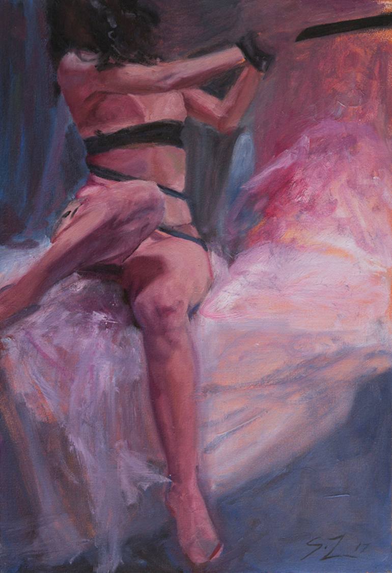 Painted in oils in loose expressive brushstrokes, Zuluaga depicts bound bodies - often her own - in the nude, both as fragments and as a whole. The tension of bindings struggling against distorted human flesh rendered in vibrant colors creates stark visual contrasts and a feeling of unease in the viewer. Zuluaga seeks to represent non-tangible concepts with literal tools; the bodily subjugation alludes to invisible systems of oppression and control, challenging the viewer to question and examine their own moral tenets and limiting paradigms. Infused with an aggressive spirit of rebellion, her work explores facets of societal conditioning (wether psychological, physical or cultural) in order to open the doors to deeper conversations around gender, sexuality and identity, while at the same time questioning contemporary beauty standards and aesthetics. Zuluaga lives and works in Florence.
