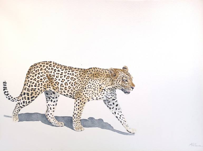 This is an original watercolor painting of a leopard, in its natural habitat. The artist's contemporary style captures the essence of this magnificent animal with a focus on minimalism. The realism achieved through watercolor on paper brings the powerful presence of the African leopard to life. Pa...
