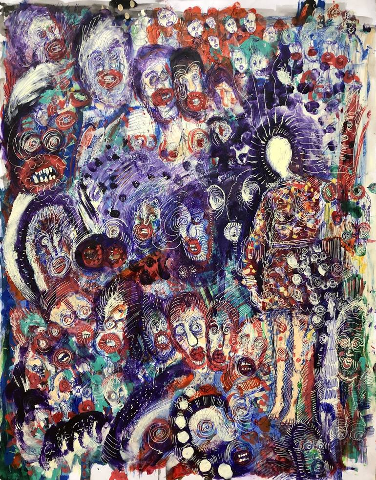 I started my artistic practice in 2020-2021. Before that, I wrote about art and artists. Born in 1975 at the foot of a stormy and changing sea, escorted by chalk cliffs, I keep deep inside me these contrasting, colorful and changing sensations that will serve me during my artistic studies in faculty. After four years, I support my Master of Fine Arts which articulates writing and plastic experiments: the mixtures of drawings-paintings-collages appear in a neo-expressionist and dadaist perspective; they try to replay, at the level of the mobilized pulsional devices, the famous child-like polymorphic perversities of the modern plastics of which Lyotard speaks about modernist avant-gardes. My Master’s director chases away my fears of an academic university and opens me to the complexity of the drawings of Grosz, Steinberg, Vallotton… Finally, it is possible to write, compose and think as an artist, to consider an aesthetic intelligence. On this enthusiastic momentum, I decided to continue with a DEA and a PhD thesis in Arts, defended in Paris in 2007 on the notion of «living forms». The publication of a book about the experimental film poet Jonas Mekas in 2014 marks the end of this writing period of my life, even if texts are published until 2019. The lockdowns in 2020 accelerate my rebirth in artistic practice. Since then, I have continued to express myself through a pulsional, rhythmic and carnival device. This precipitate of desires is composed of a mix of figurations and abstractions, graffiti, paintings and drawings, collages also sometimes: so my sensitive doodles are born. They aspire to an incandescent, dazzling, wild and poetic beauty… The vital energy, the animal desire, the primitivism, the gestural dynamics that animate them, give free rein to living forms, open and fragmented, like baroque sketches with perpetual metamorphoses. The light and ephemeral character of these sketched forms, free, becoming, is in tension with the all-over (or vacui horror) that saturates and weighs down my spaces. This complex interlude defines one of the components of my style. My paintings are the product of joyful drunkenness, vertigo and mixtures that have for pagan sire Dionysus. Their orgy, moving and colorful forms correspond to the bizarre, multiform and versicolored beauties dear to the romantics and Baudelaire. When I scribble, my paper takes on an excess of sensitive presence. I paint to excite myself and to keep quiet.