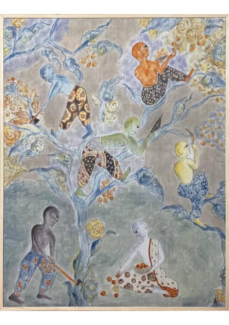 The painting titled "Leshya" metaphorically illustrates various human dispositions and corresponding actions through six distinct figures rendered in different colors. Created with natural dyes derived from sources such as madder root, pomegranate peel, turmeric, iron rust, and indigo, the artwork i...