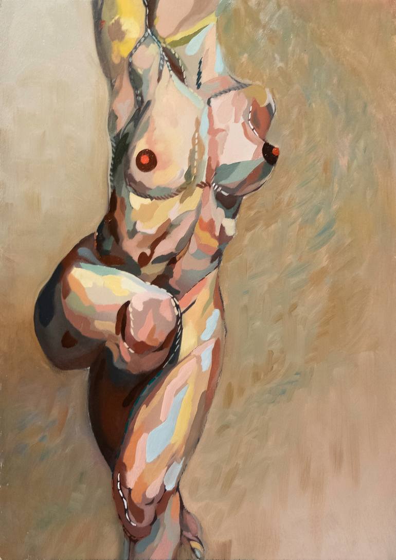 Oil on wood panel. The painting by itself is an improvisation. Letting go and instinctively forming the colors into a female body and not having limits. The title of this work was inspired by Delacroix's 'Liberty Leading the People' painting.