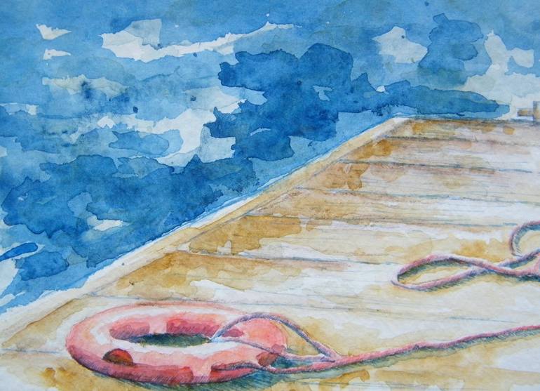 Watercolor painting. A life buoy on a footbridge.