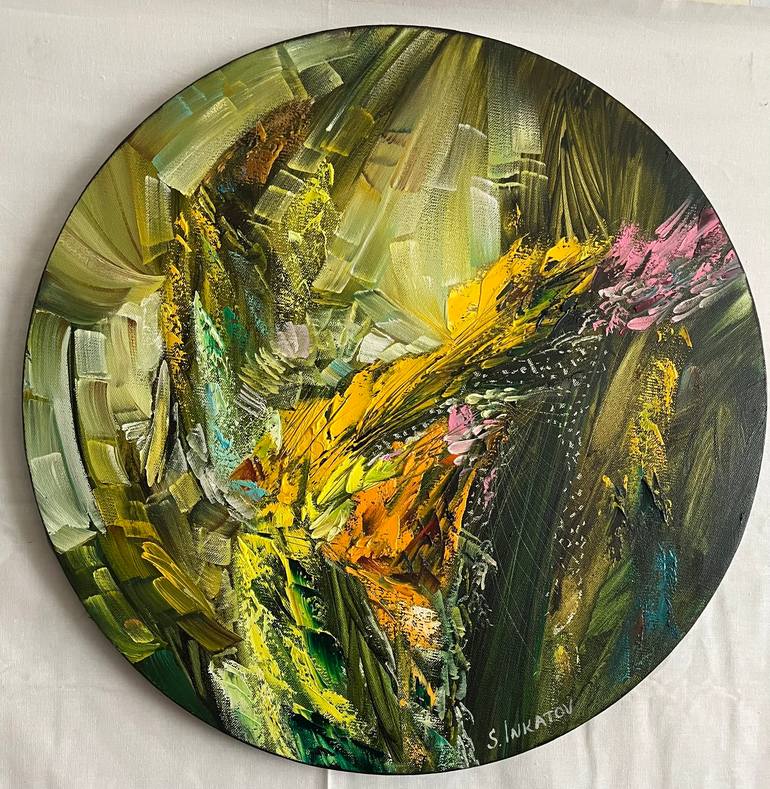 This captivating round abstract artwork, "Life Philosophy 4", is part of the artist's exploration of "Life Philosophy". The oil paint is expertly applied on canvas, creating a visually engaging piece. The abstract nature of the artwork invites contemplation and personal interpretation. Its circular...