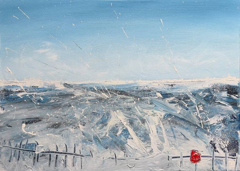 The sky is a gradient of light blues with a few scattered white streaks, representing the liveliness of the waves. The lower portion of the painting is dominated by broad, dynamic brushstrokes in whites and blues, creating a turbulent and textured surface that mimics the look of the stormy sea. Thin...