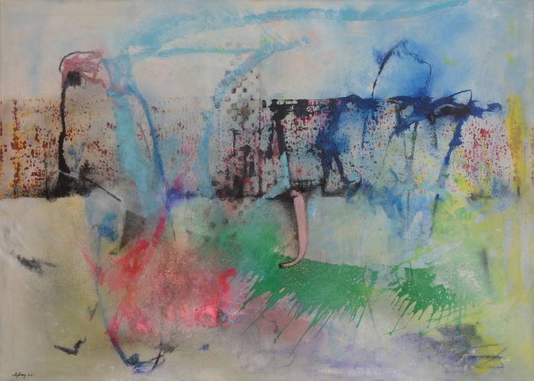 Vibrant colors and a horizontal signal create a pleasant spring summer atmosphere in the viewer.From childhood to the present day, it is a fun expressive and thought-provoking work.