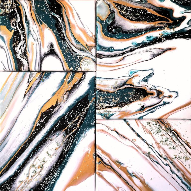 This work of art represents the way of life, as I see and feel it, so surprising and different. this artwork has four pieces About this picture: -This is an original stretched canvas acrylic painting. -The paint is applied to wooden blocks. -Colors: white, blue, gold, black. Sides are painted, ...