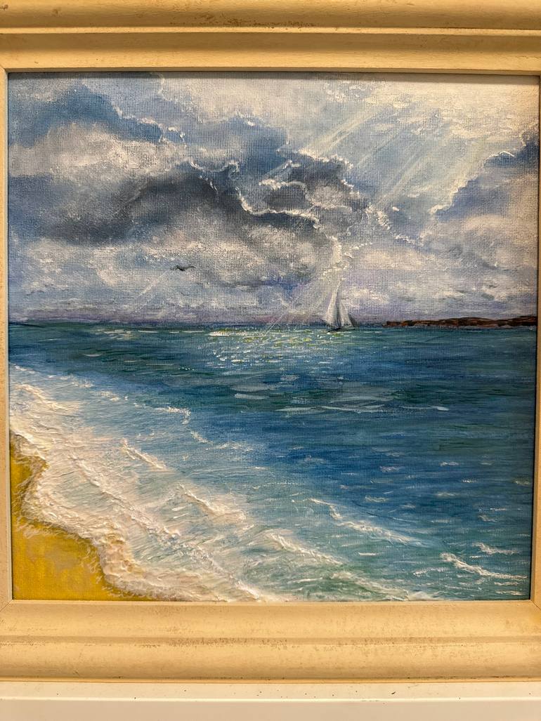 I painted this seascape with acrylics, adding modeling paste only to the foam of the waves to create a textured, sculptural effect. After the thunderstorm, the sea regains its calm, the air feels fresh, and the horizon opens again. The artwork is presented in a solid, natural light wooden frame, whi...