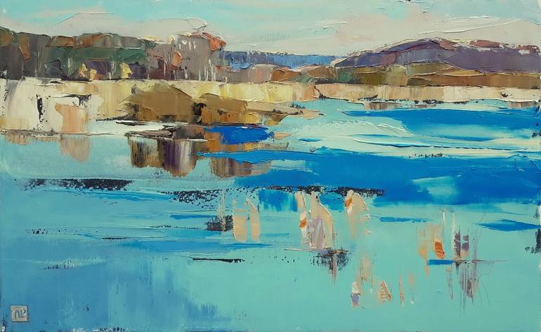 Light  autumn  landscape, the  sun  is  still  illuminating  the  reeds. The  water  shimmers  with  blue  and turguoise  colors.