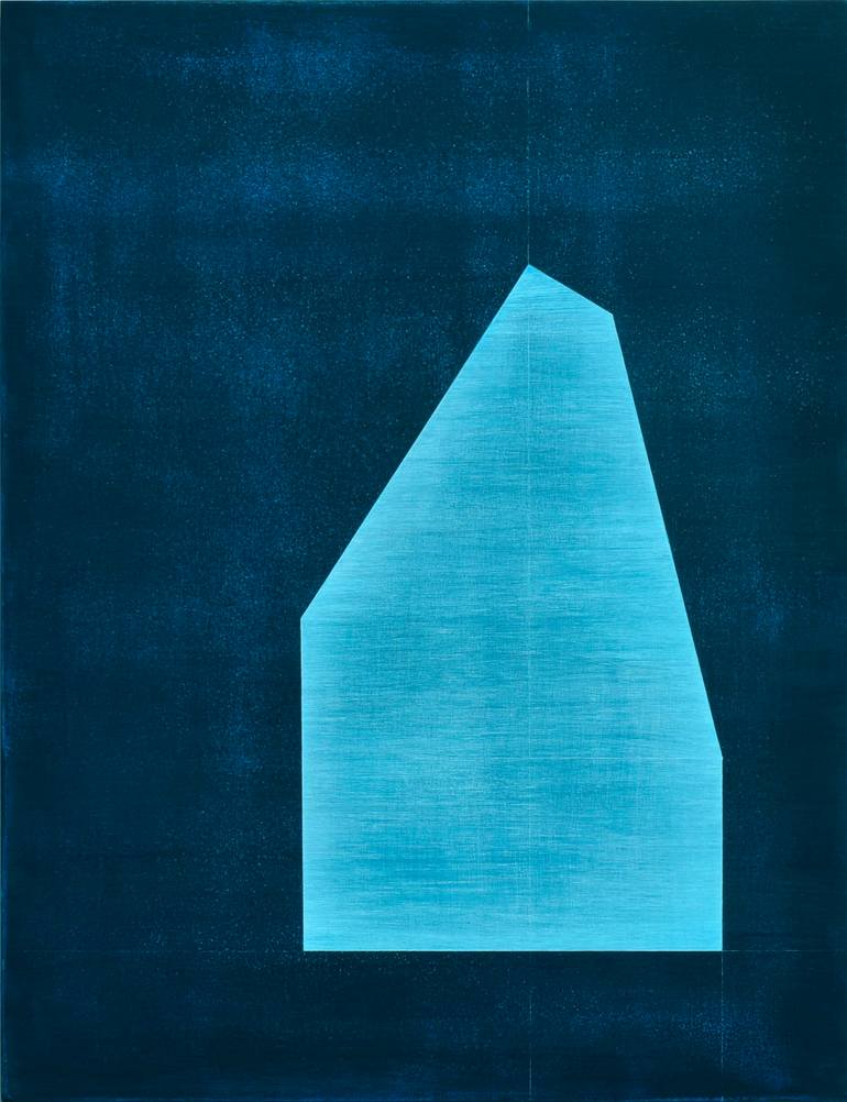 This bold blue painting is inspired by architectural forms and illuminated windows. Acrylic on gesso on cradled painting panel. 40.5 x 30.5 x 2cm