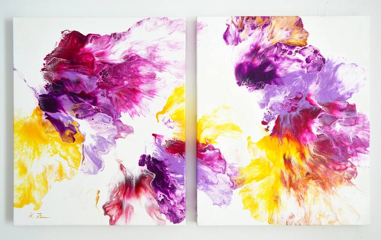 Two abstract acrylic paintings on stretched canvas surface. This is a diptych (multi panel) consisting of two paintings each with dimensions 24 (height) x 20 (width) x 1.5 (depth) inches. Total dimension together 24 (height) x 40 (width) x 1.5 (dept). These two paintings can be hang on the wall nex...