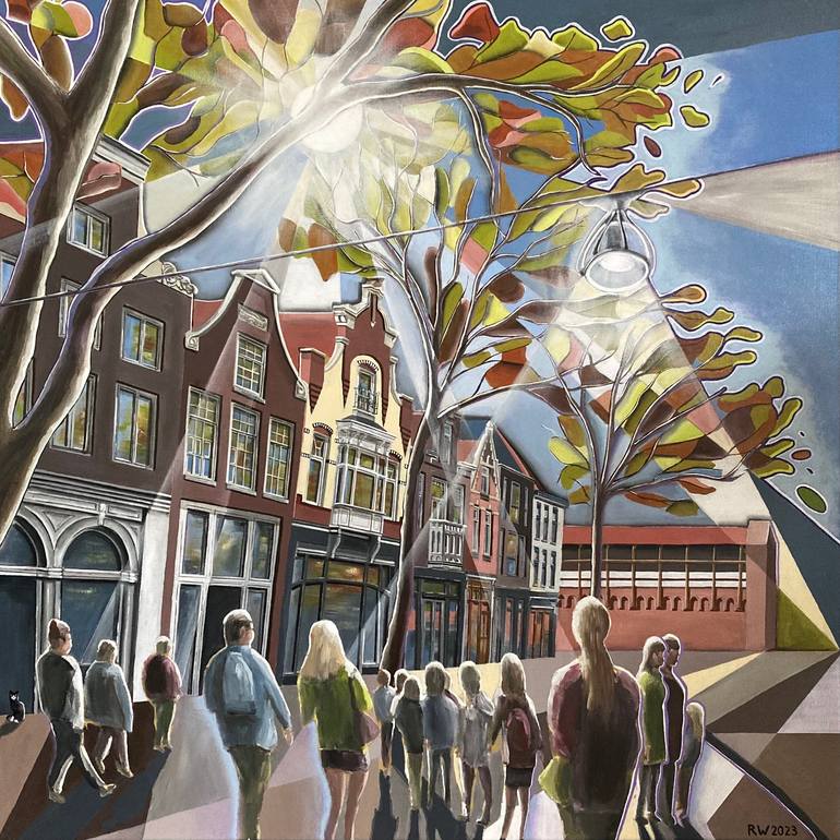 I am driven by the beauty of life and inspired by the structures we create. My work recreates the world in my mind, embraced by vibrant colors and light, focusing on beauty, yet occasionally shaped by the darker influences of human existence. René Wissink is a professional Dutch artist. He is a passionate art lover and creator of large colorful and visually compelling paintings. His work is inspired by the beauty of dutch towns and facades, the power of color and light, and the splendor of nature. It can be described as a mixture of abstract and figurative painting, realistic elements and unexpected objects. Using vibrant colors, strong lines, shades and cubist elements, he aims to recreate the beauty of the scene, engage and draw his audience into the painting, create a feeling of happiness or challenge their perceptions. René Wissink was born and raised in the Netherlands, and now lives and works in Houten, a small city in the middle of the Netherlands.