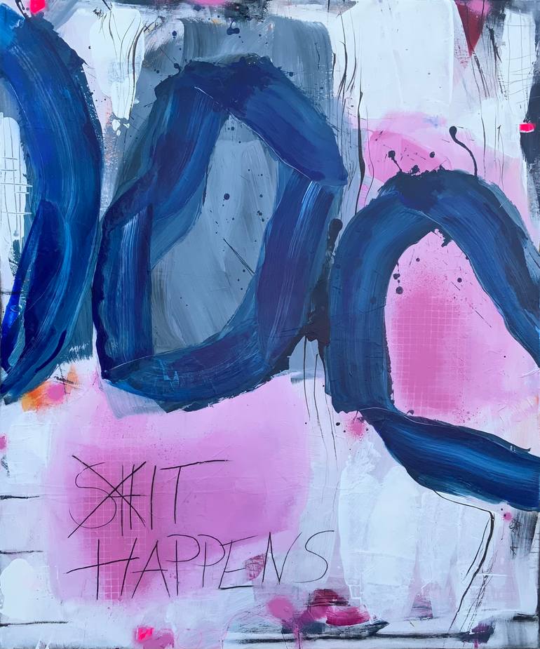 "Lil Troublemaker" is a work that lives through its many layers and dynamics. The round elements glow in powerful shades of blue, partly on a gray background. The pink in turn glows on the white background. The writing in the picture sends a small message... Even things that seem almost lost can be ...