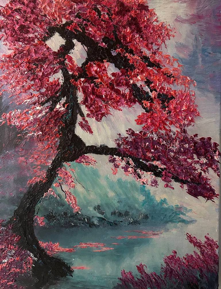 In this oil painting, I've explored the vibrant dance of color and light, capturing a tree blooming with rich, lilac hues that contrast against a softly tumultuous sky and water. I utilized the impressionist style to evoke the fleeting beauty of nature, creating a dynamic yet serene atmosphere. This...