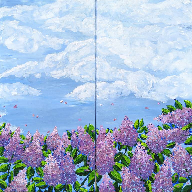 The first painting showcases lilac flowers on a summer cloudy day, highlighting their beauty as the amethyst of the earth. This simple yet universal design can effortlessly enhance any wall, capturing the delicate whispers of a serene afternoon. It is a diptych.