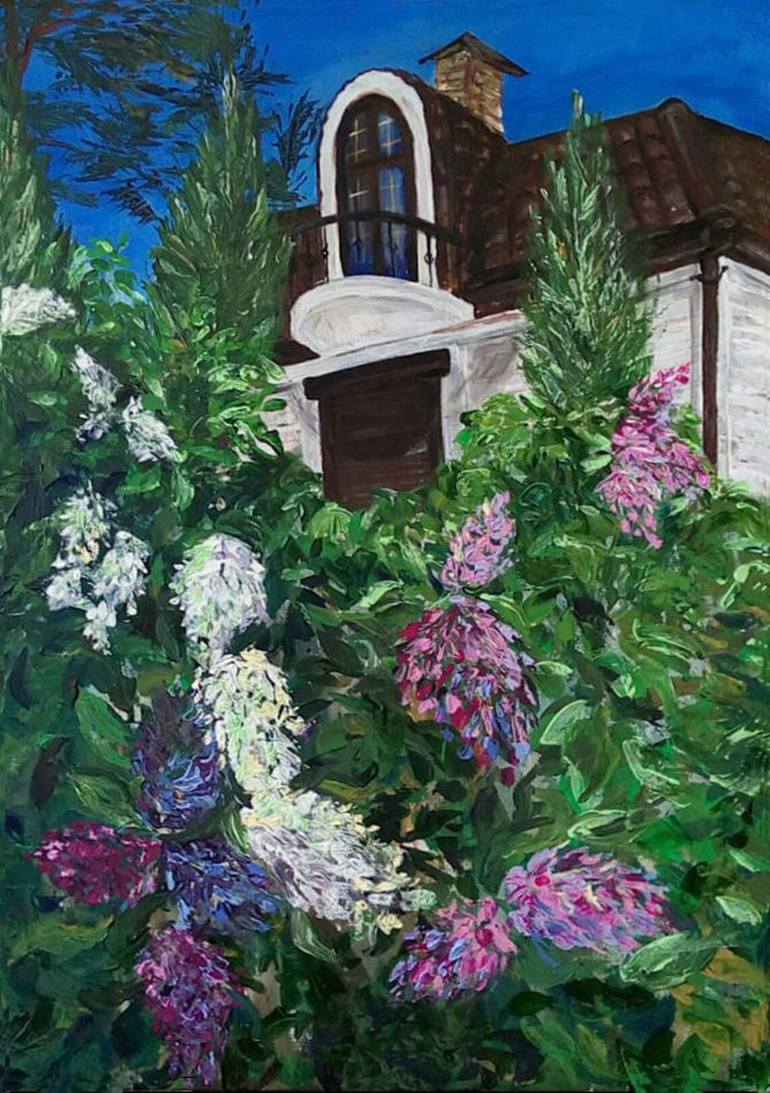 Lilac in bloom Spring Nature Scenery Vibrant Floral Landscape Sunny and cheerful colors artwork Original acrylic painting on stretched cotton canvas with brushes and palette knife • Artist - Iryna Baklanova • Year — 2016 • Size 20x28 inches (50x70 cm) • The sides painted the same colors • Signed a...