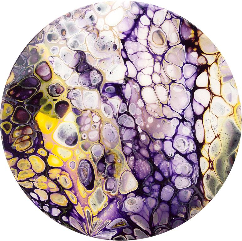 This painting, created using the acrylic pouring technique on a wooden circle with a diameter of 80 cm, is coated with epoxy resin, which adds an extra effect. Thanks to the epoxy resin, the surface of the painting has become glossy, enhancing the depth and brightness of the colors. The light reflec...
