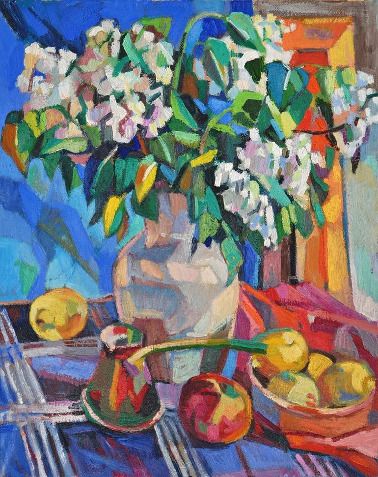 Original oil on canvas . Unframed. Spring flowers in a white vase. Spring scene.