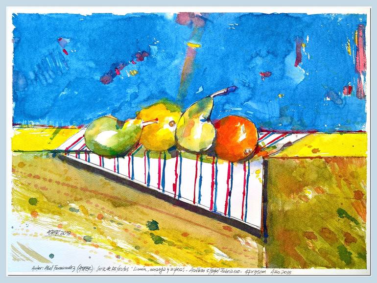 Autor: Asfer-Abel Fernandez Título: "Limón naranja y dos peras" Serie: Bodegones y Naturalezas Muertas Técnica: Acrílico aguado sobre papel Soporte: Papel Canson 300 gramos Dimensiones: 35x47 cm Año: 2018 La obra forma parte de la Serie "Las Frutas" (Naturalezas muertas y Bodegones) compuestos por ...