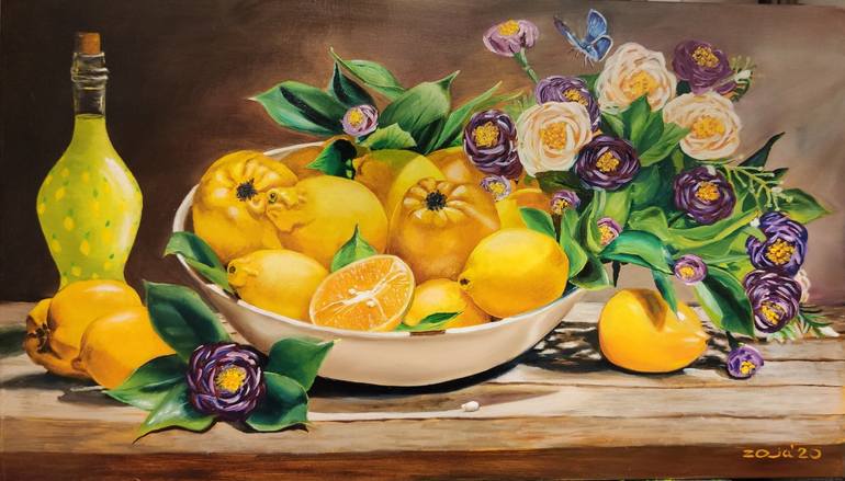 Liqueur (Limoncello) an alcoholic drink that welcomes the sun and the light, the scent and the rich flavor of lemon. Hand painted picture with high quality, lightfast colors. High quality cotton canvas, stretched on a wooden frame and ready to hang on the wall. The edges of the canvas are painted. ...