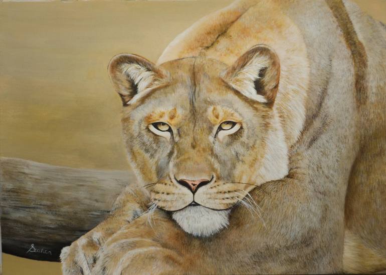 The painting depicts a lioness in a moment of relaxation, set against the backdrop of a desert sunset. The colours of the painting are primarily warm and earthy, featuring a rich golden hue that creates a sense of serenity and warmth. With strikingly deep eyes that seem to gaze directly past the vie...