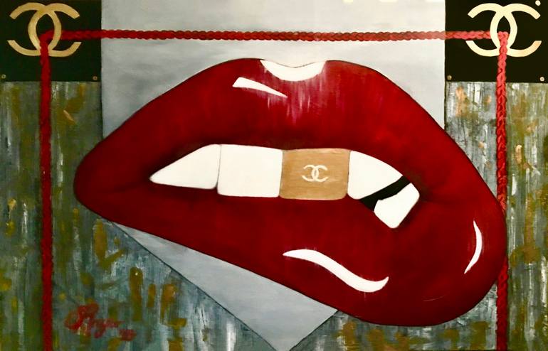 Pop Art style Lips, with a Gold tooth and a Chanel Logo Tooth Cap. The painting was inspired by "50 Shades of Grey". The grey colors, the lip biting, the red rope, and the tie in the background, with a Chanel Logo shout out on the bed posts. This painting adds fun, fashion, and a little naughty to ...