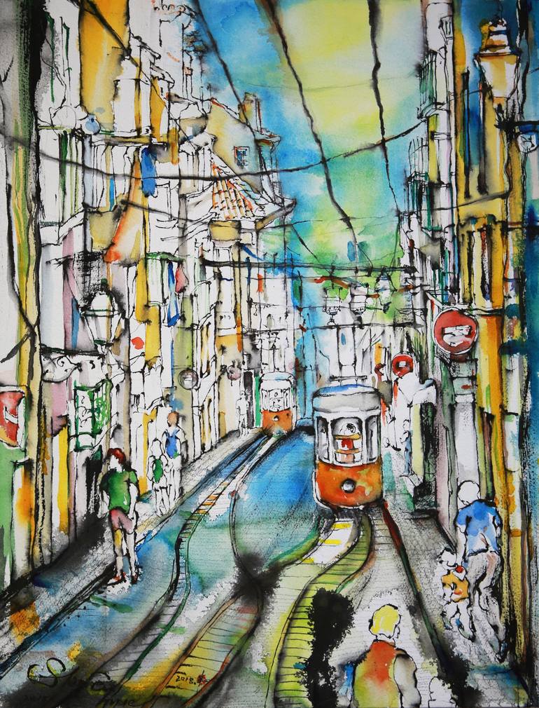The streets of Lisbon express the joy of travel with watercolor and ink on paper