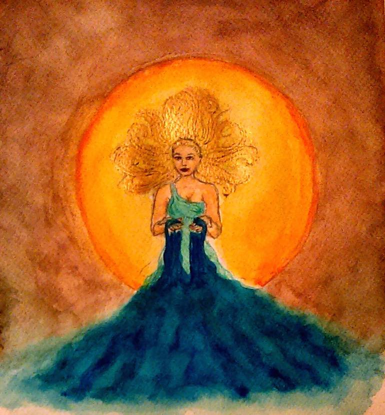 Litha is the celebration of the summer solstice. Pictured, is a combination of both Sunna and Sulis. The Norse deity, Sunna, is the goddess of the Sun, healing. Sulis is the Celtic sun goddess as well as that of sacred waters. Original watercolor.