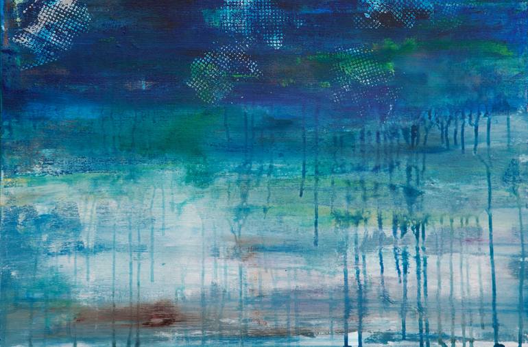 Lithosphere 185 is an original painting, created with acrylic paint on gallery-wrapped canvas. It has a width of 30 inches and a height of 20 inches with a depth of 1.5 inches (20x30x1.5). The colors used in the painting are teal, blue, green, brown, gray, yellow, red, and iridescent, metallic silv...