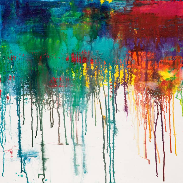 Lithosphere 194 is an original painting, created with acrylic paint on gallery-wrapped canvas. It has a width of 24 inches and a height of 24 inches with a depth of 1.5 inches (24x24x1.5). The colors used in the painting are white, red, yellow, teal, blue, orange, purple, and green, and the paintin...
